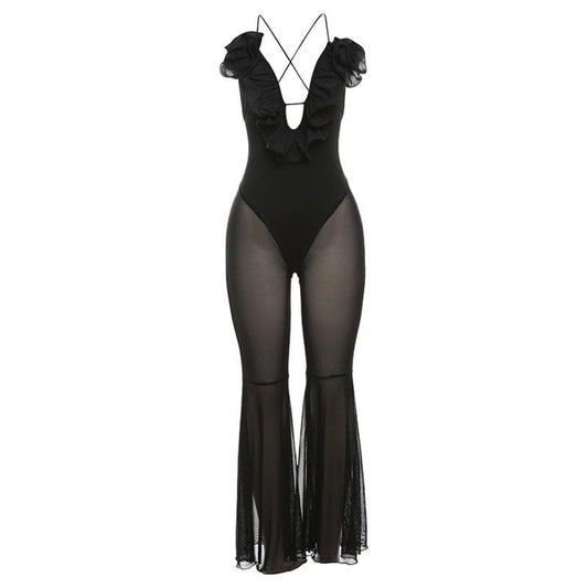Flower applique ruffle lace up mesh cami jumpsuit