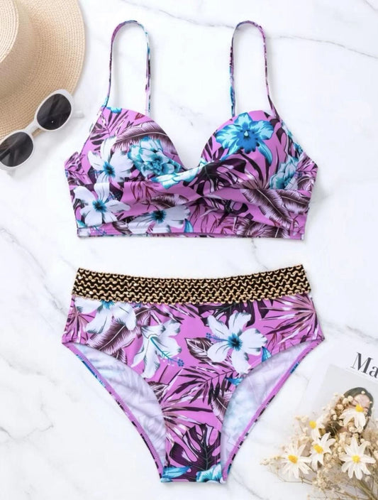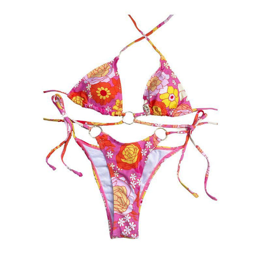 Flower pattern contrast o ring self tie halter padded bikini swimwear