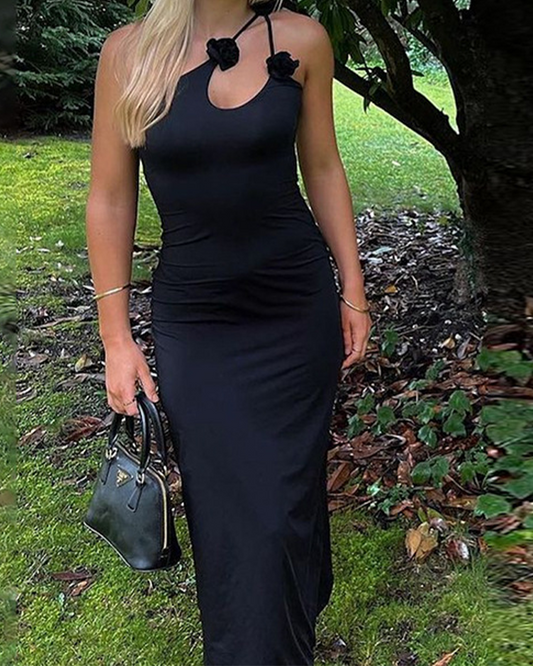Flowers Decorated Slope-Shouldered Sheathed Haltered Dress