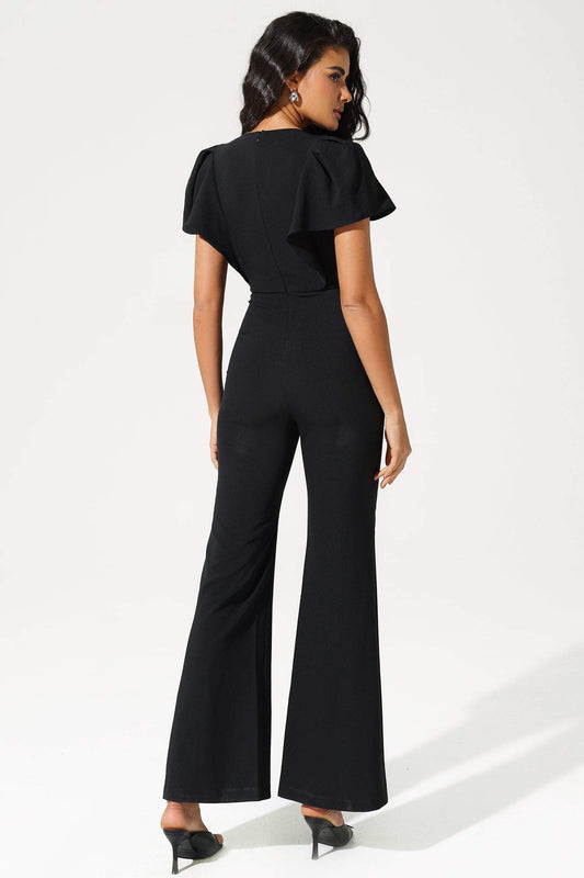 Flutter Sleeve V-Neck Ruffle Hem Tapered Waist Jumpsuit