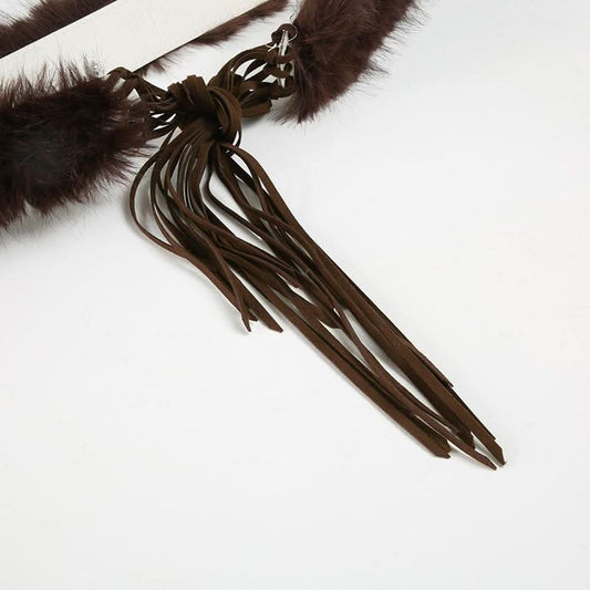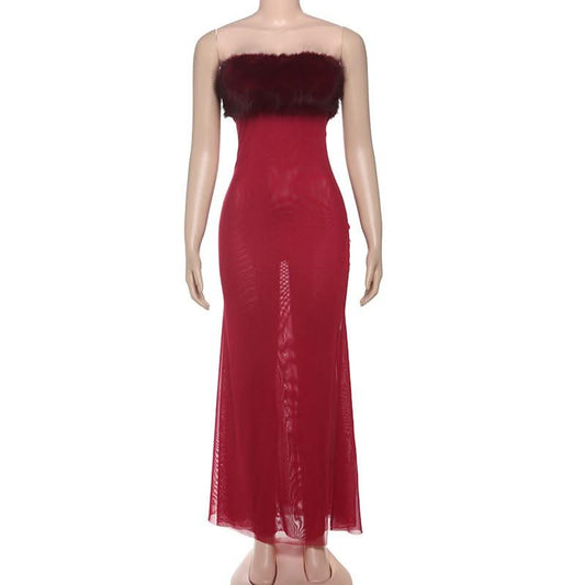 Fluffy sweetheart neck gloves fluffy self tie mini dress