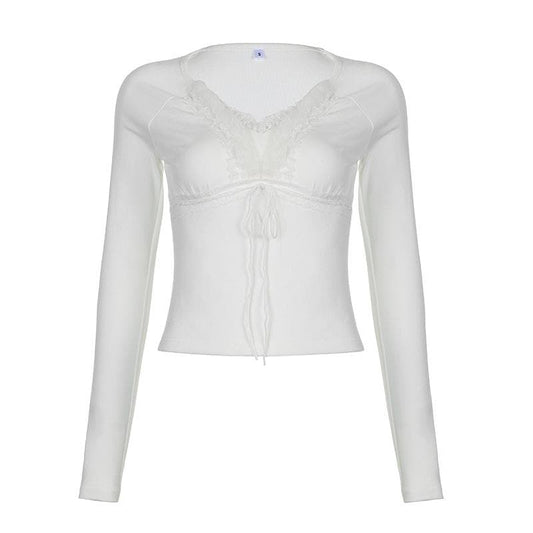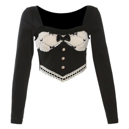 Fluffy patchwork square neck contrast lace hem long sleeve crop top-final-sale