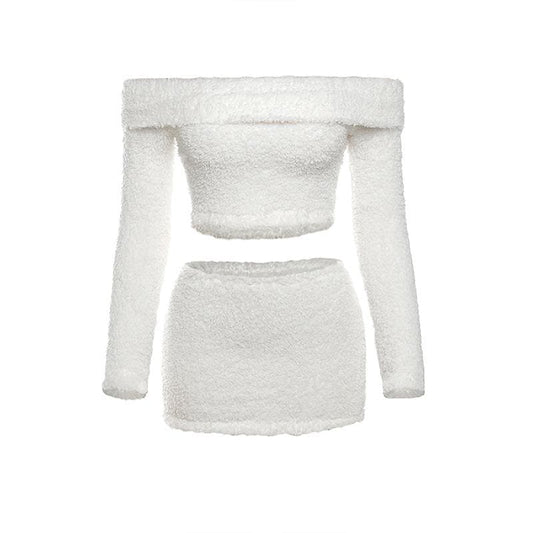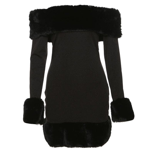 Fluffy patchwork solid off shoulder long sleeve mini dress