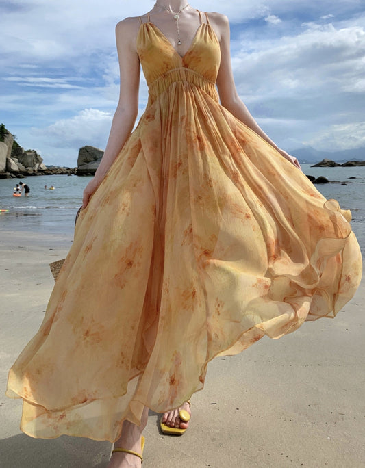 French Vintage-Inspired Watercolor Maxi Dress Soft, Elegant, & Airy