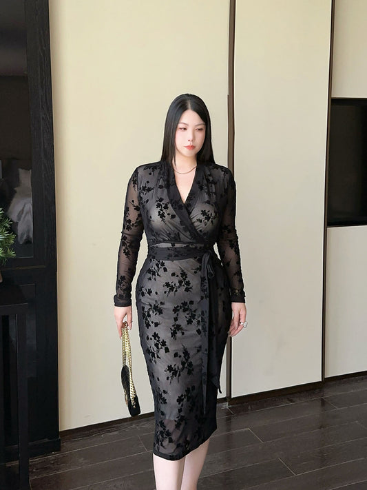 French Sheer V-Neck Wrap Lace Dress Plus-Size
