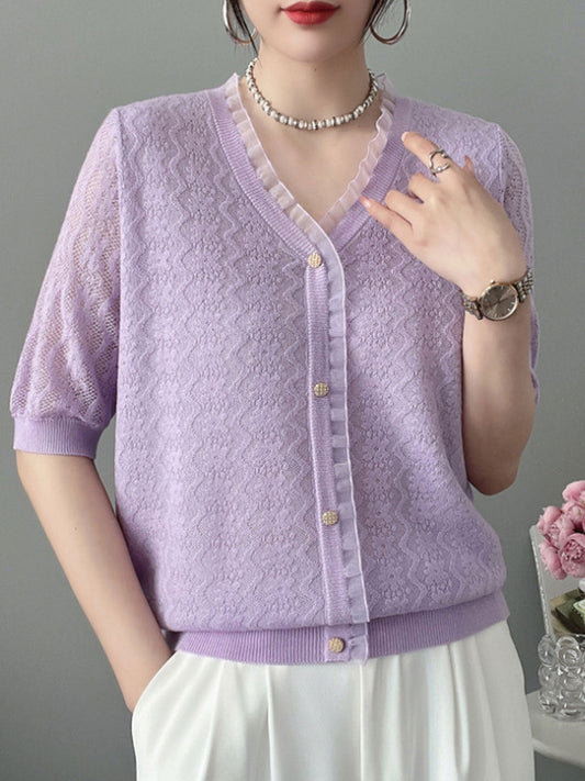 Genesis Elegant V-Neck Lace Stitching Knitted Cardigan