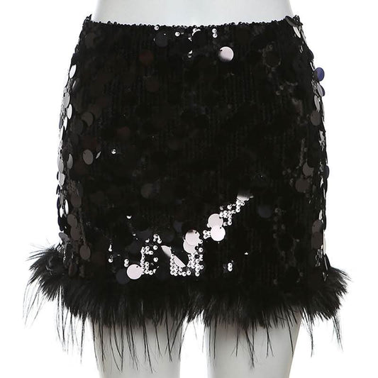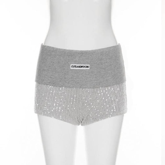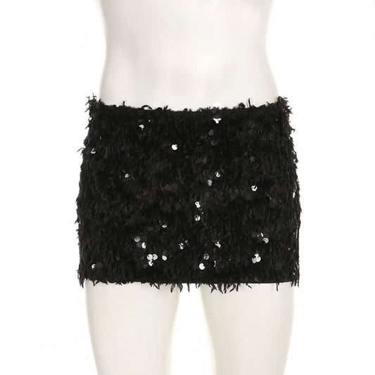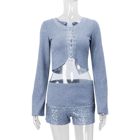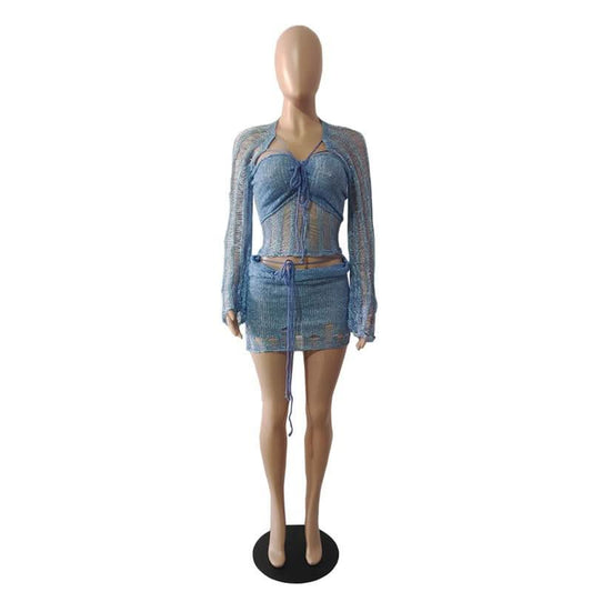 Glitter knitted long sleeve hollow out 3 piece mini skirt set