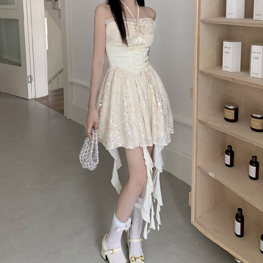 Glitter Pink Lace Up Backless Halter Two Piece Set