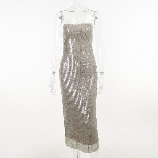 Glitter u neck see through backless cami maxi dress