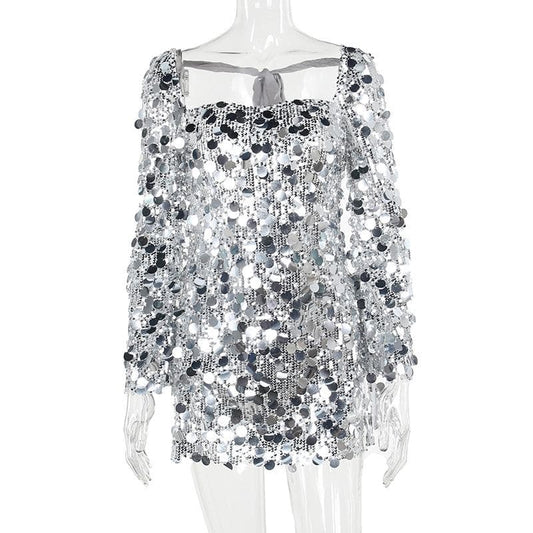 Glitter self tie long sleeve slit backless mini dress