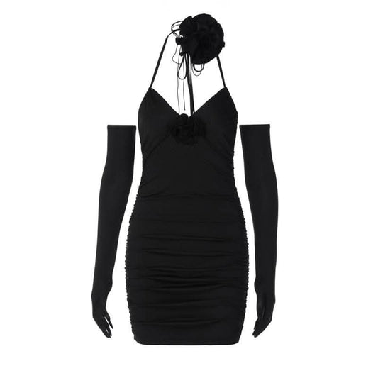 Gloves v neck halter backless flower applique mini dress-final-sale