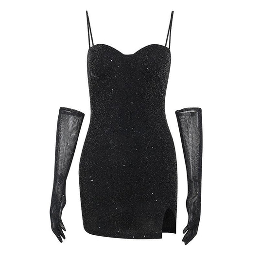 Gloves solid beaded slit sweetheart neck cami mini dress