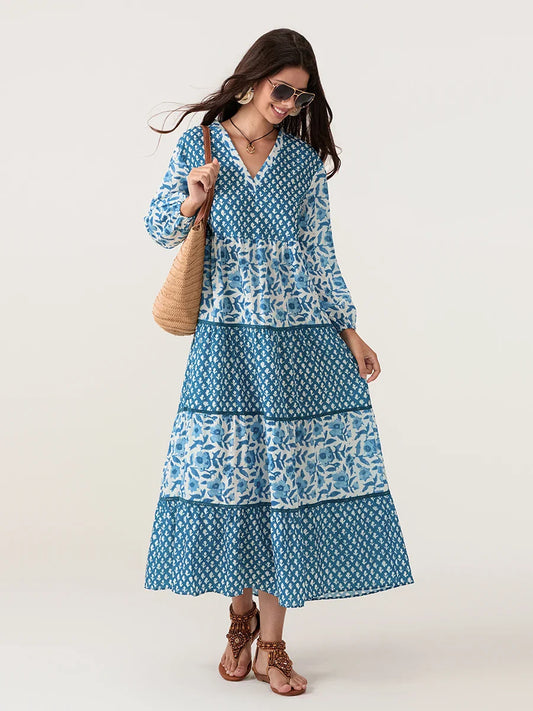Autumn Floral Long Sleeve V-Neck Loose A-Line Floral Dress