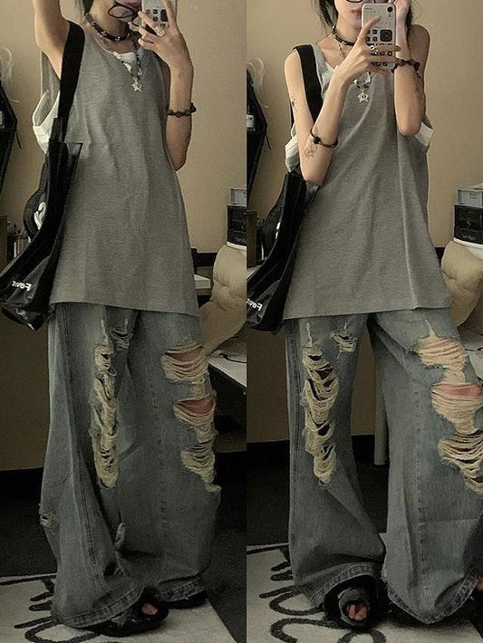 Grey Vintage Backless Halter Tank Top & Pants Set