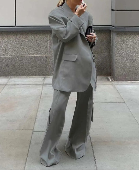 Grey Lapel Button Simple Trousers Office Two Piece Set