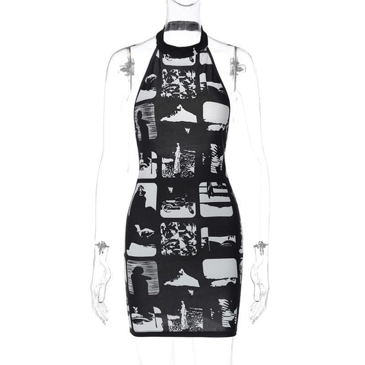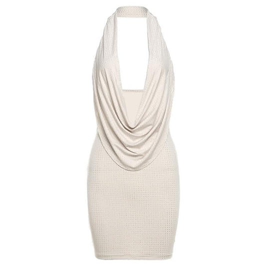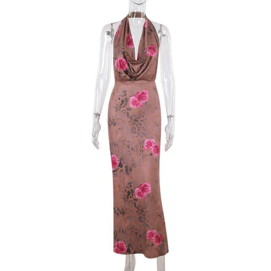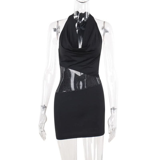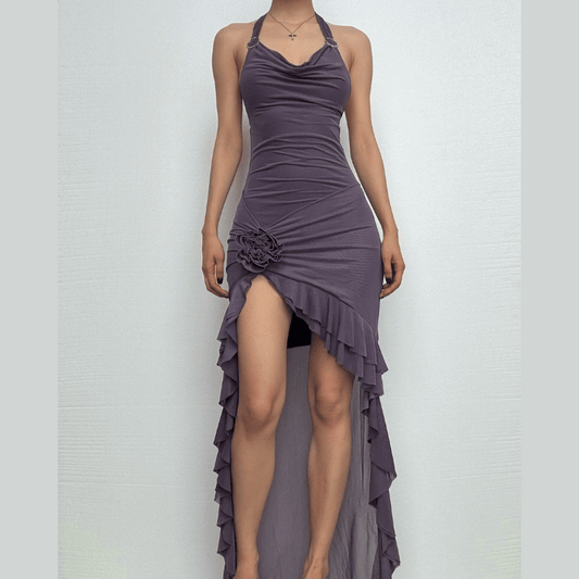 Halter cowl neck fishnet patchwork ruched maxi dress