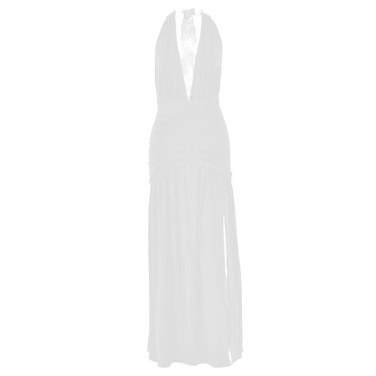 Halter deep v neck slit backless ruched maxi dress