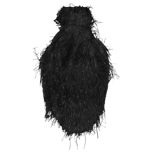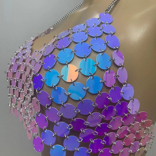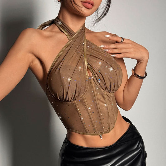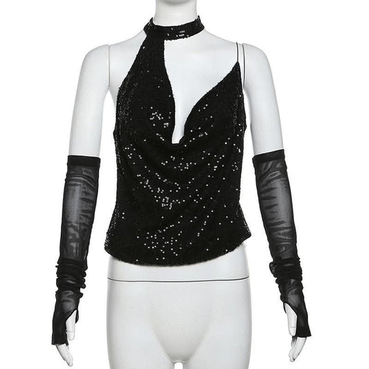 Halter gloves button glitter cowl neck irregular top-final-sale
