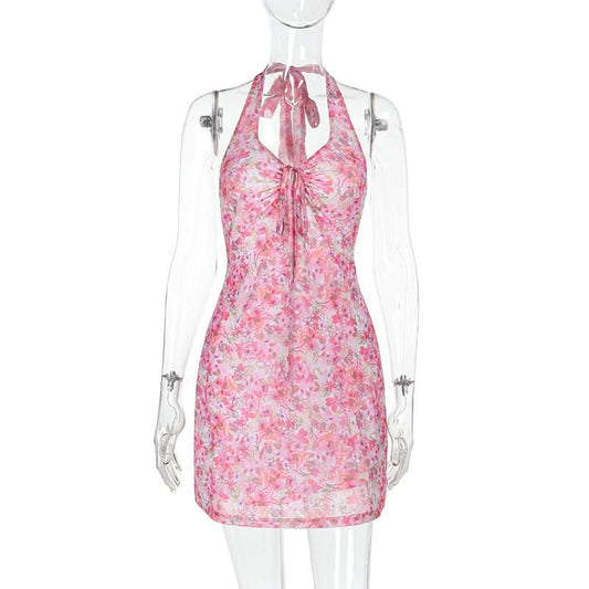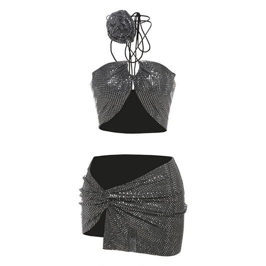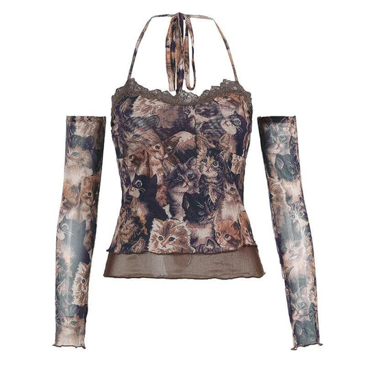 Halter fluffy beaded bowknot "Hello Kitty" pattern backless 2 piece top