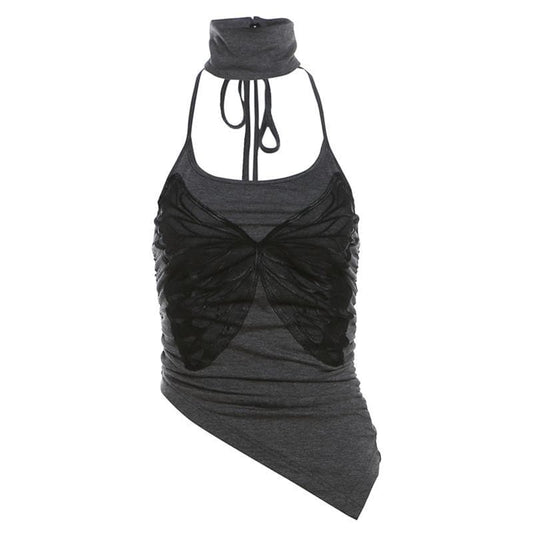 Halter hollow out lace hem flower print gloves cut out mini dress