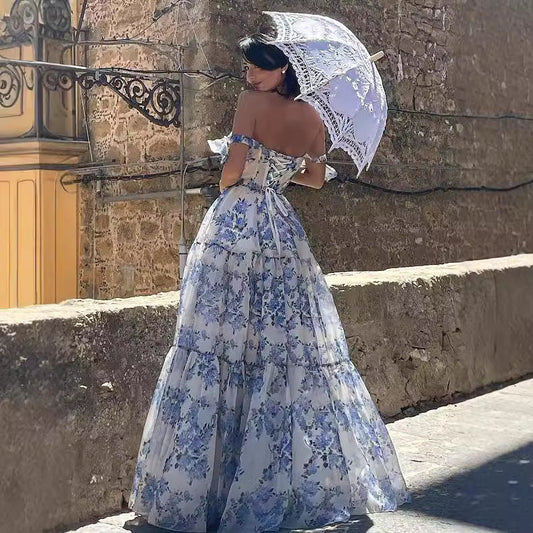 Backless Ruffled Hem Printing Midi Boho Dress