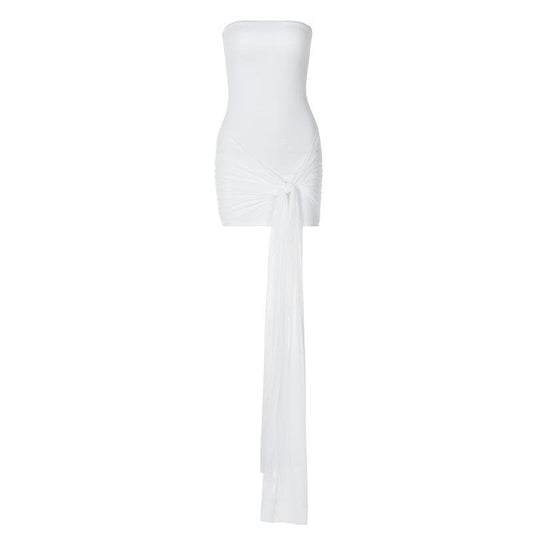 Backless ruched mesh self tie solid tube mini dress