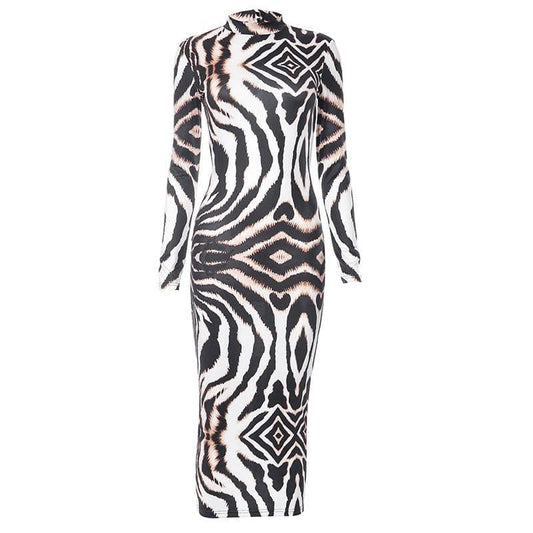 Backless self tie long sleeve tiger print contrast midi dress
