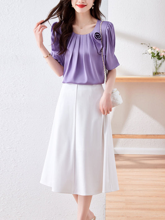 Bailey Classic Crew Neck Floral Satin Chiffon Top-Purple