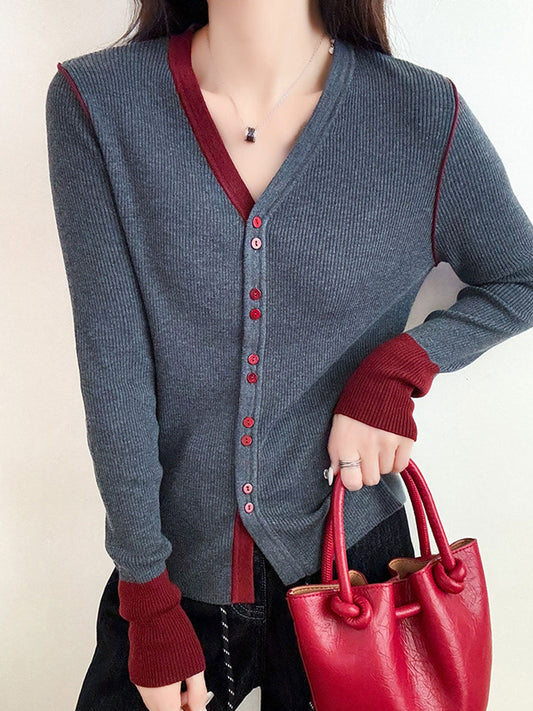 Bailey Classic V-Neck Colorblock Knitted Cardigan-Gray