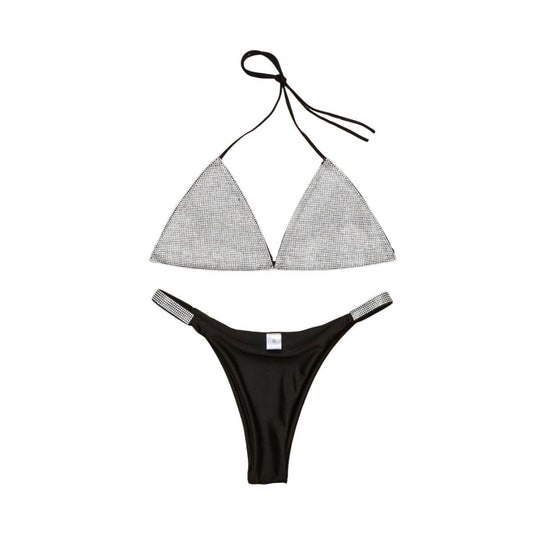 Beaded v neck halter backless contrast self tie bikini swimwear