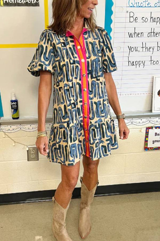 Beige Abstract Print Pleated Bubble Sleeve Mini Dress