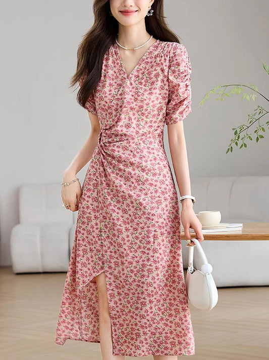Bella Elegant V-Neck Floral Printed Silk Dress