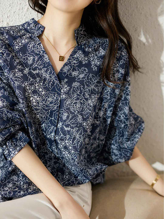 Bella Elegant V-Neck Lantern Sleeve Floral Printed Top