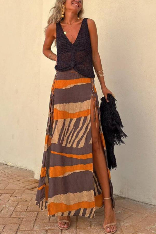 Bendita Colorblock Print Elastic Waist Side Lace-up Slit Maxi Skirt