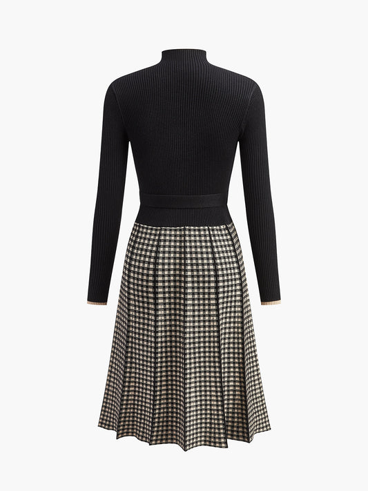 Belted Plaid Panel Sweater Dress