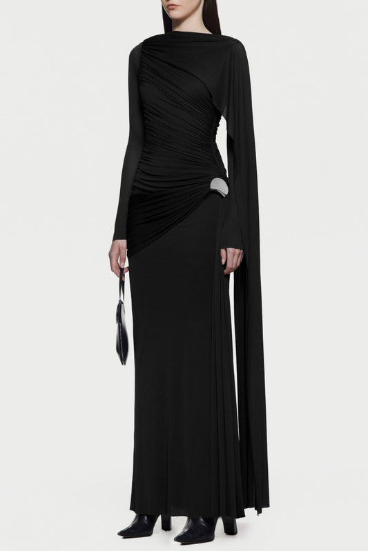 Betsey Asymmetrical Flap Ruched Maxi Dress - Black