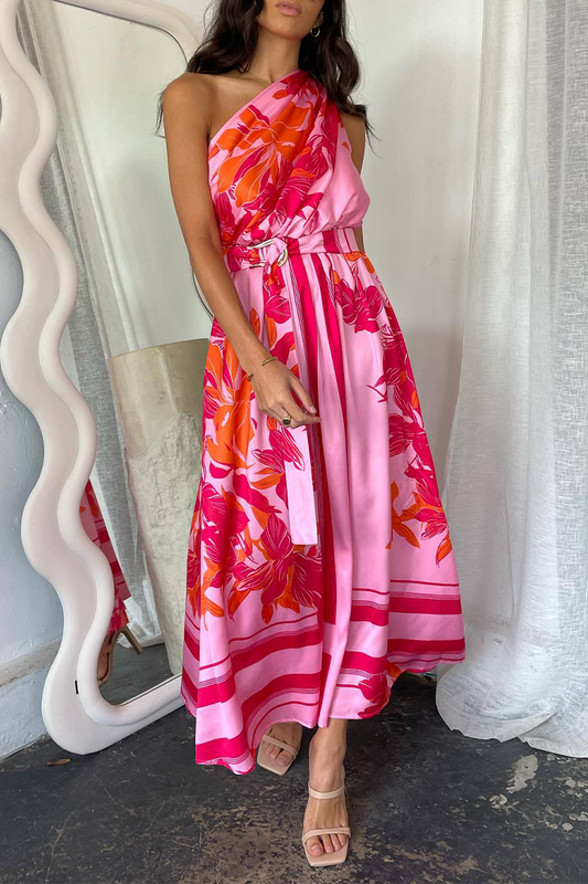 Elegant Floral Print With Belt Irregular Oblique Collar Irregular Dresses