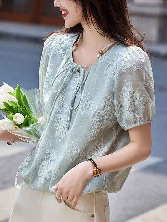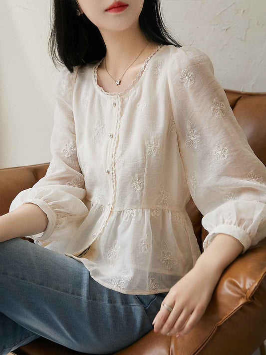Trinity Retro Embroidered Hollowed Shirt-White