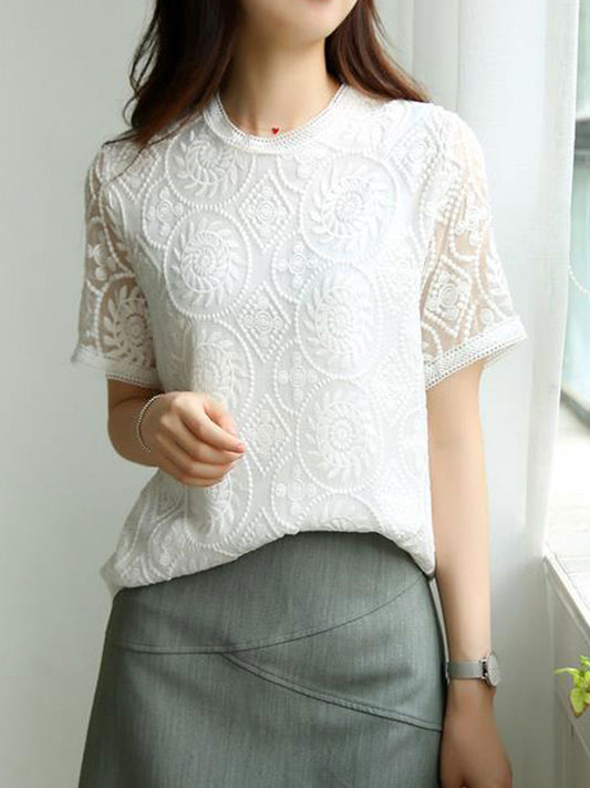 Valeria Elegant Crew Neck Lace Embroidered Chiffon Top