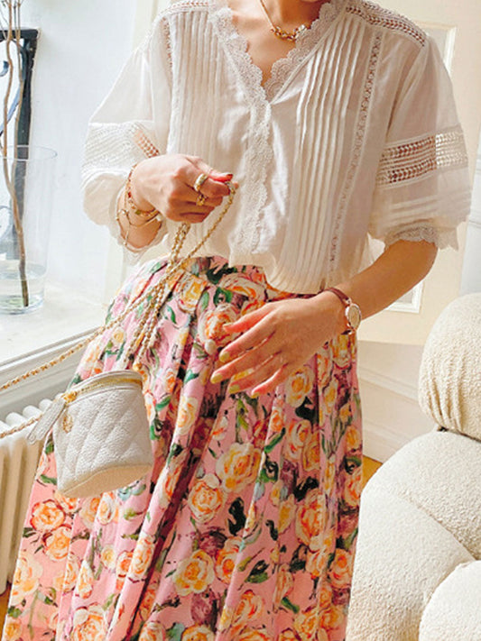 Valeria Classic V-Neck Solid Color Hollowed Lace Top