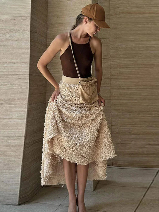Elegant 3D Flower Solid A-Line Elastic High Waist Skirt