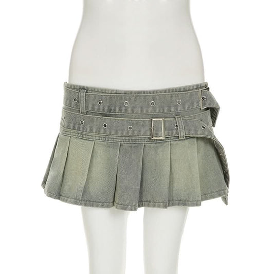Denim belt pleated A line mini skirt