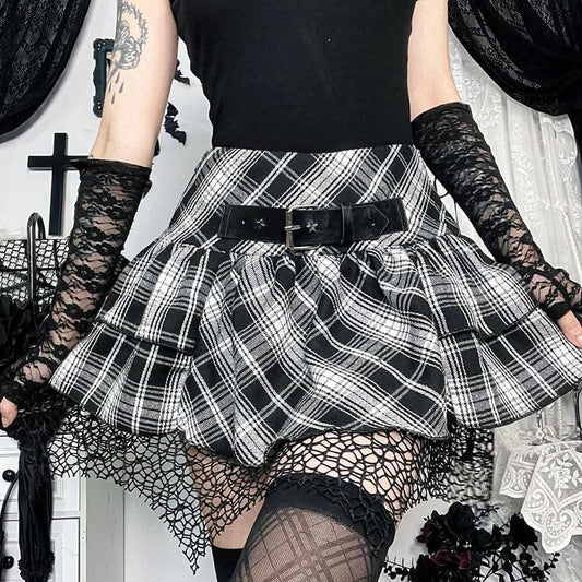 Plaid ruched hollow out buckle A line cut out mini skirt