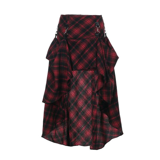 Plaid irregular buckle contrast maxi skirt