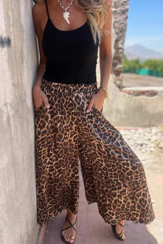 Leopard Print Elastic Waist Loose Pocket Wide Leg Pants