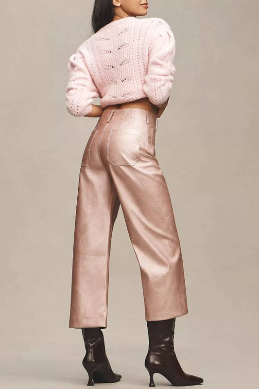Colette Metallic Faux Leather Pocket Cropped Wide Leg Stretch Pants