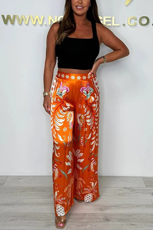 Satin Plant Print Elastic Waist Loose Wide Leg Pants