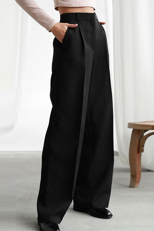 Work Street Solid Patchwork Pocket Loose High Waist Wide Leg Solid Color Bottoms(3 Colors)