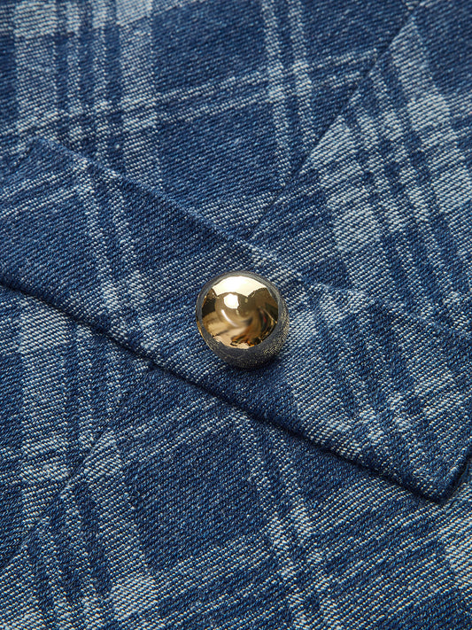 Metal Button Crew-Neck Decor-Pockets Denim Dress