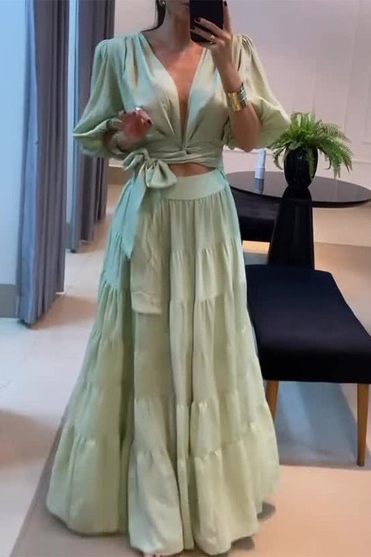 Elegant Solid Asymmetrical V Neck Long Sleeve Two Pieces